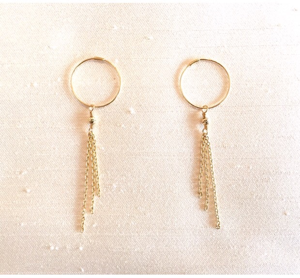 18金イエローゴールドのフープ型フリンジのピアスで、動きに合わせて揺れる様子が印象的です。